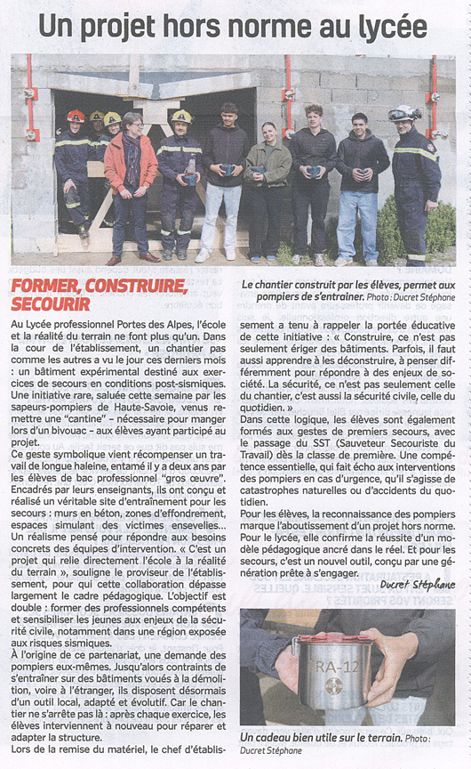 Ce jeudi 26 mars, les sapeurs-pompiers se sont rendus au lycée des métiers Porte des Alpes pour un entraînement sur la “zone d’entraînement aux secours après séismes” créée par les élèves de bac pro Techniciens du bâtiment en organisation et réalisation du gros-œuvre. En février, les sapeurs-pompiers de Haute-Savoie et Savoie ont passé leur accréditation dans le cadre de l’exercice MUSAR (unités de sauvetage, appui et recherche) FRA-12, notamment sur cette structure.